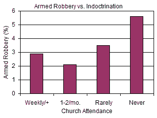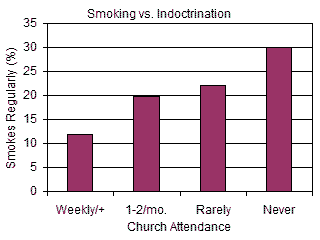 In one of the largest studies of its kind, the University of North Carolina at Chapel Hill examined the role of religion in the lives of nearly 2500 adolescents.9 The adolescents indicated the level of their indoctrination (i.e., frequency of church attendance) and importance of religion, along with a number of activities that they have or have not participated in. Listed below are graphs of behaviors that would generally be considered to be unfavorable. To see larger versions of the graphs, just hover your cursor over the thumbnail image.