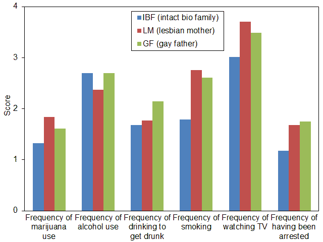 Likewise, if one examines Regnerus's Table 4 data, which mostly examines negative outcomes among children, differences between gay and straight parents tend to diminish when all groups are combined. For example, the use of of marijuana and alcohol are virtually identical among children of gay and straight parents, although smoking, TV watching, and having been arrested are somewhat higher in the children of gay parents (see figures to right).